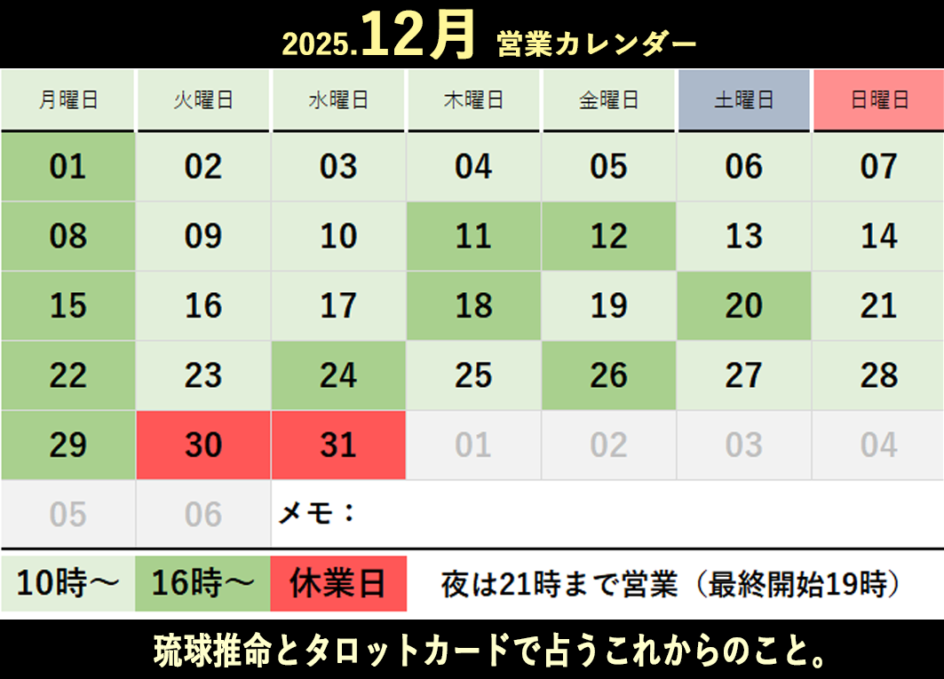 12月は、気持ちの整理をしたり、新しい年に向けて方向性を確認したりする方が多くなる時期です。今月もオフィスニライでは、皆さまの心に寄り添いながら丁寧に鑑定を行ってまいります。